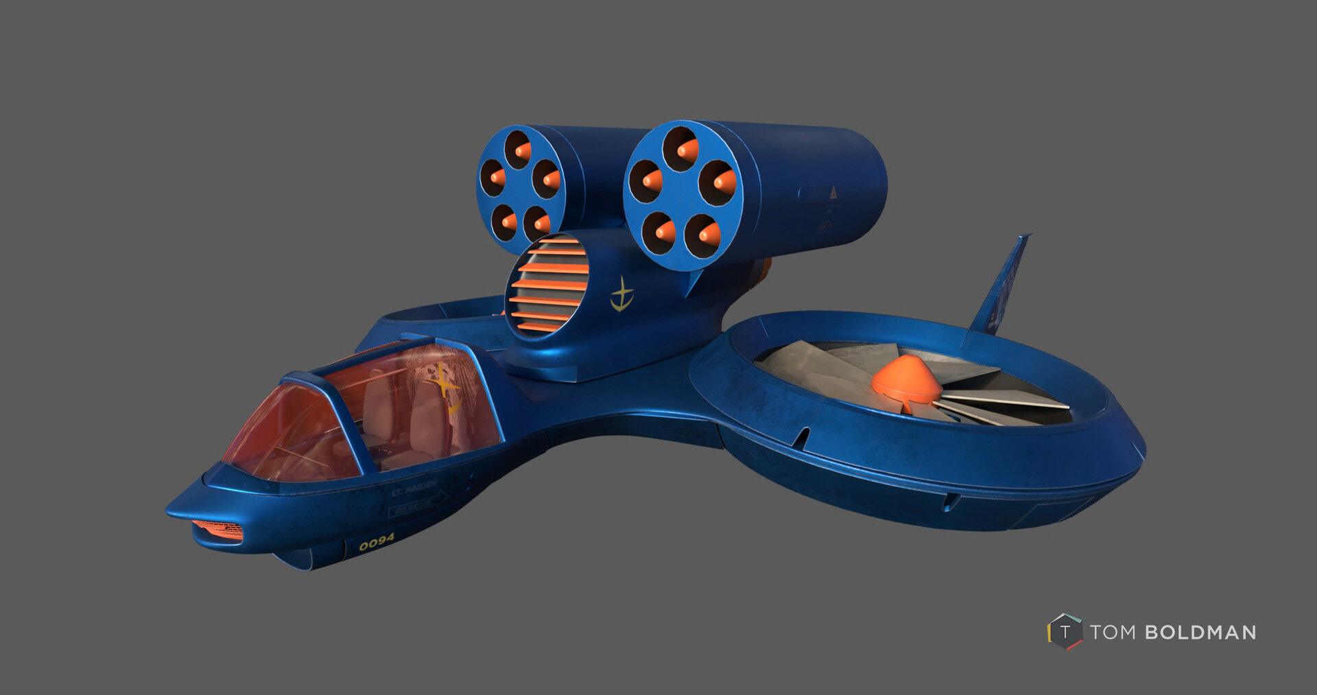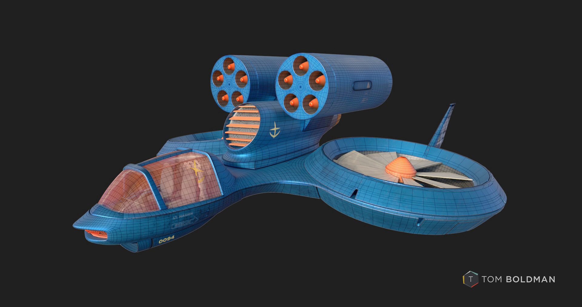 The model details are built out using references from F-16s, Osprey, Airbus and a 1980s Thunderbird.
